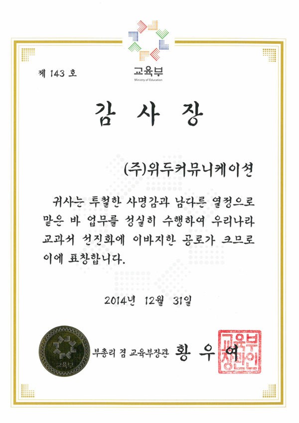 감사장 제 143호 페이지 정보 작성자 WeDu 댓글 0건 조회 4,622회 작성일 19-05-30 19:33 본문 2014-12-31 감사장 제 143호 교과서 선진화 부총리 겸 교육부장관 황우여 List Previous산업통상자원부 표창장 19.05.30 Next한국여성벤처협회 표창장 19.05.30