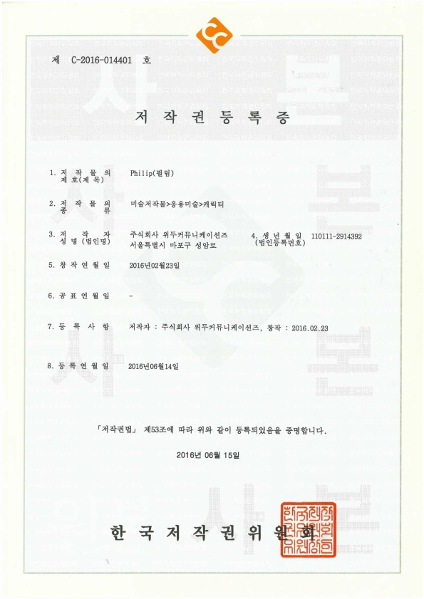 [한국/저작권] 필립 페이지 정보 작성자 WeDu 댓글 0건 조회 4,627회 작성일 19-05-30 19:09 본문 2016-06-14 저작권 C-2016-014401 필립 / 미술저작물>응용미술>캐릭터 List Previous[한국/저작권] 월터 19.05.30 Next[한국/저작권] 아리스 19.05.30