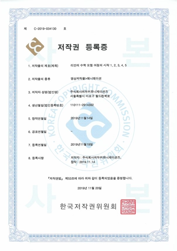 [한국/저작권] 리안의 수학 모험 여정의 시작 1,2,3,4,5 페이지 정보 작성자 WeDu 댓글 0건 조회 4,466회 작성일 21-12-31 12:36 본문 2019-11-20 저작권 C-2019-034130 영상저작물>애니메이션 List Previous[한국/저작권] OLL KIDS/MATH 21.12.31 Next[한국/저작권] 리안의 수학 모험 애니메이션 OST 19.11.25
