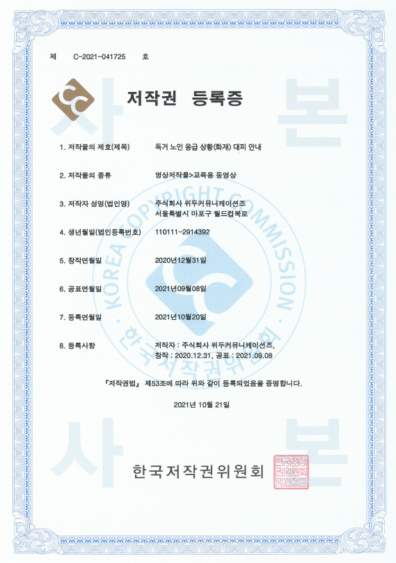 [한국/저작권] 독거 노인 응급 상황(화재) 대피 안내 페이지 정보 작성자 WeDu 댓글 0건 조회 4,856회 작성일 21-12-31 12:41 본문 2021-10-21 저작권 C-2021-041725 영상저작물>교육용 동영상 List Previous[한국/저작권] 장보기 인지훈련 게임 21.12.31 Next[한국/저작권] OLL KIDS/MATH 21.12.31
